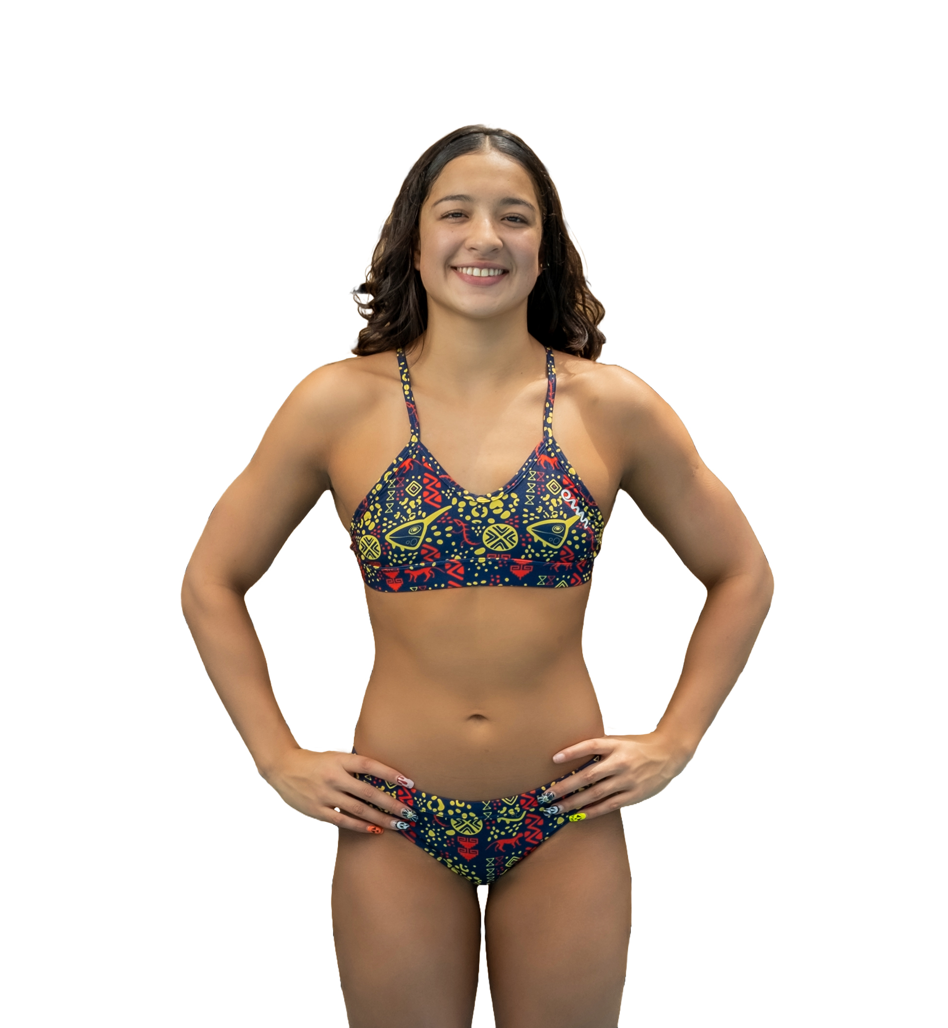 Top con cobertura mínima con estampado "Aborigen" original de la marca OMAR PINZON Swimwear inspirado en nuestra hermosa Colombia.