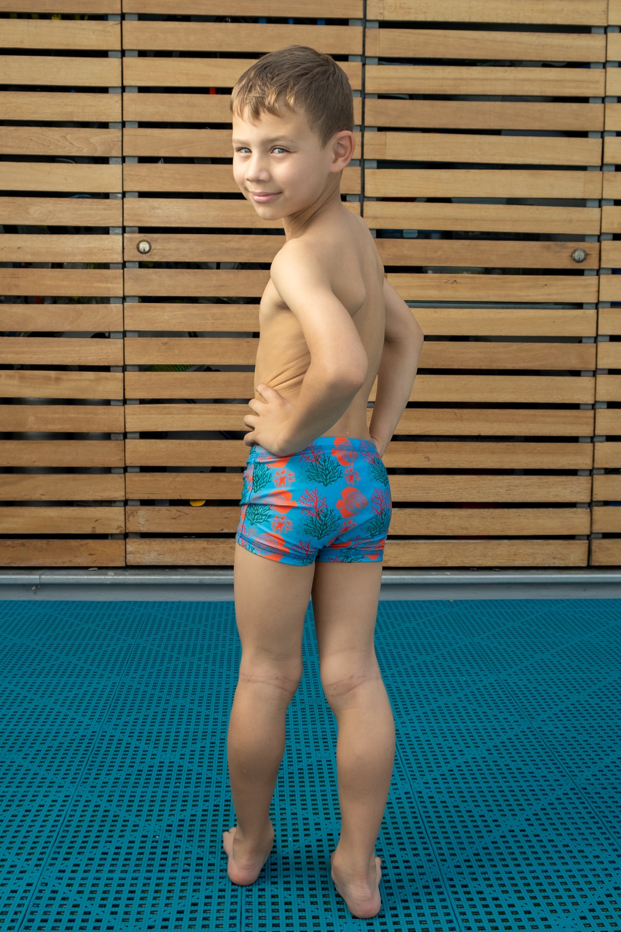 Pantaloneta de niño diseñada para competir y entrenar, con estampado "Corales" original de la marca OMAR PINZON Swimwear inspirado en nuestros hermosos arrecifes de corales colombianos
