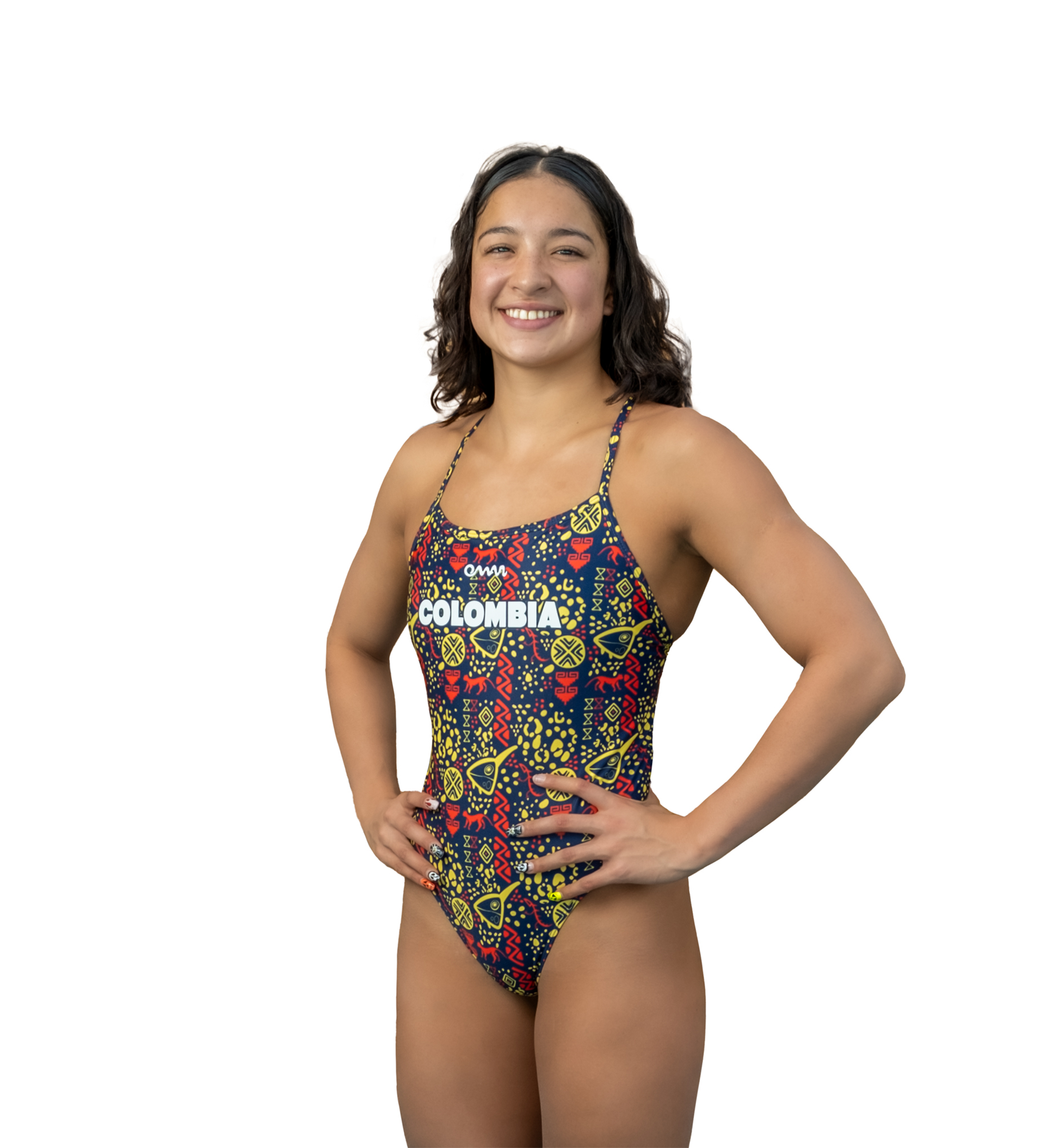 Vestido de baño enterizo con una altura media de pierna, con estampado "Aborigen" original de la marca OMAR PINZON Swimwear inspirado en nuestra hermosa Colombia.